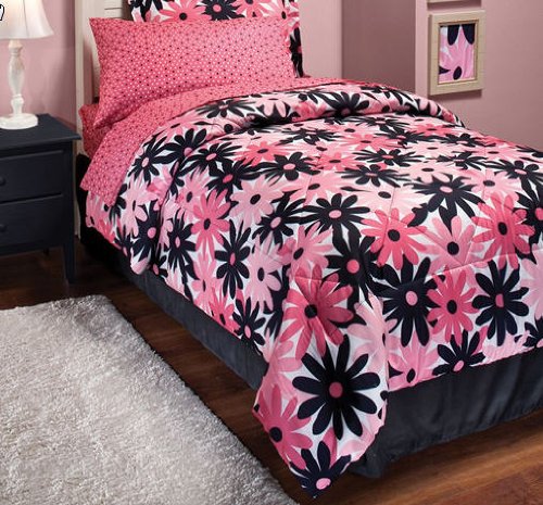 Update your bedroom with this great Bed in a Bag The comforter features a black and pink daisy print You will love this bedding set whether you are sleeping reading or lounging in your room The set includes 1- TWIN Size Comforter 1- Flat Sheet 1- Fitted Sheet 1- Pillowcase 1- Sham 1- Beds